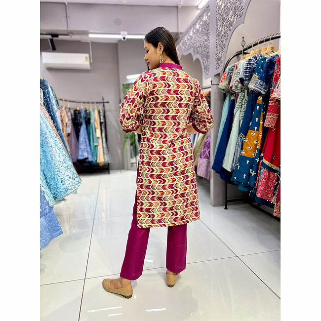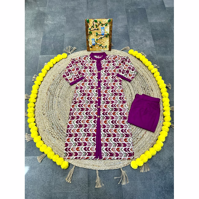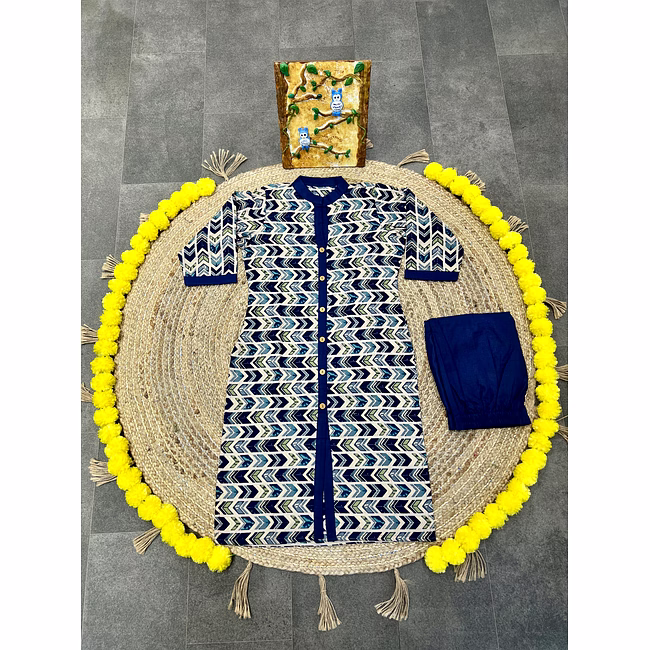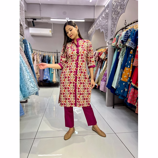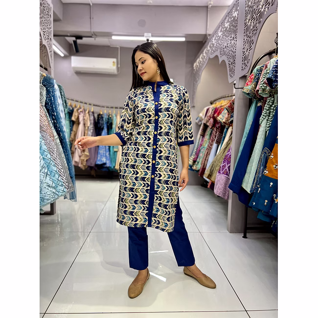 Kurti*Kurti Fabric* :- Heavy Cotton*Kurti Colour* :- Rani / Blue*Neck Pattern* :- Stand Collar*Kurti Length* :- 40”*Sleeve Length* :- 16”*Kurti Work* :- Heavy Print with Foil + Wooden Button*Kurti Pattern* :- Side Cut*Kurti Size* :- M-38/Xl-42 + MarginPant*Pant Fabric* :- Heavy Magic Slub*Pant Colour* :- Rani / Blue*Pant Length* :- 37”*Waist Size* :- UP To 40 / 44”*Pattern* :- Ankle Length*Weight* :- 400 GMNote:-“Color Variation May be Change Due To Light ,Camera And Mobile Screen Effect.”BE aware of some sellers using our shoot pictures and selling cheap quality Designed for international appeal, this top delivers both elegance and export-ready quality.